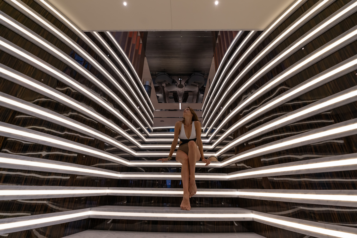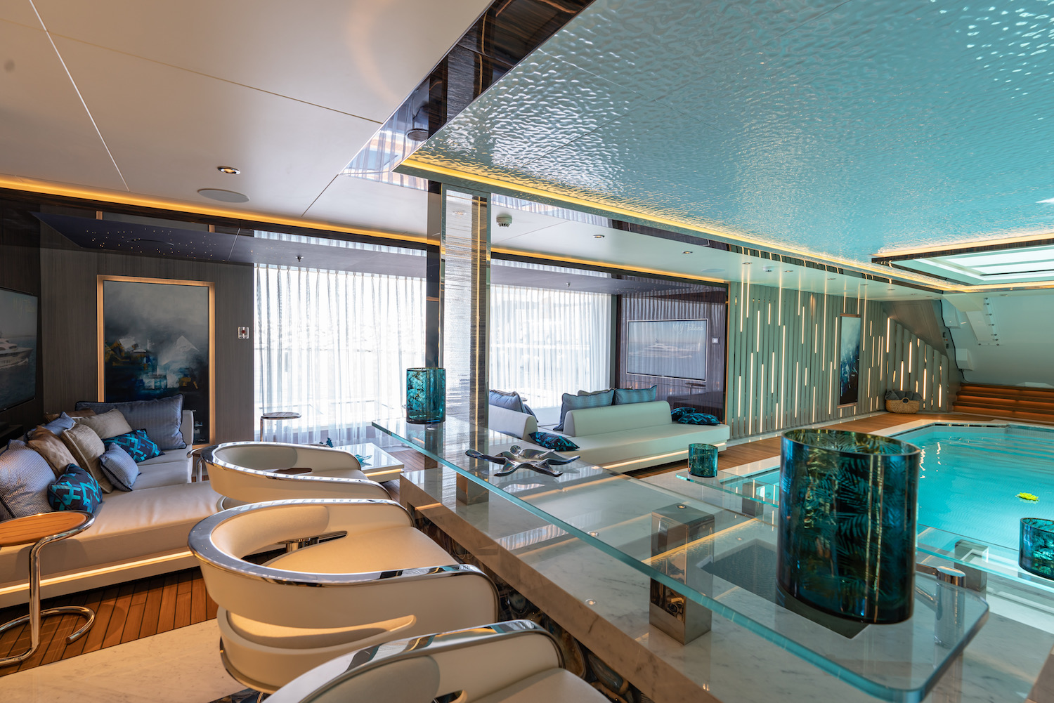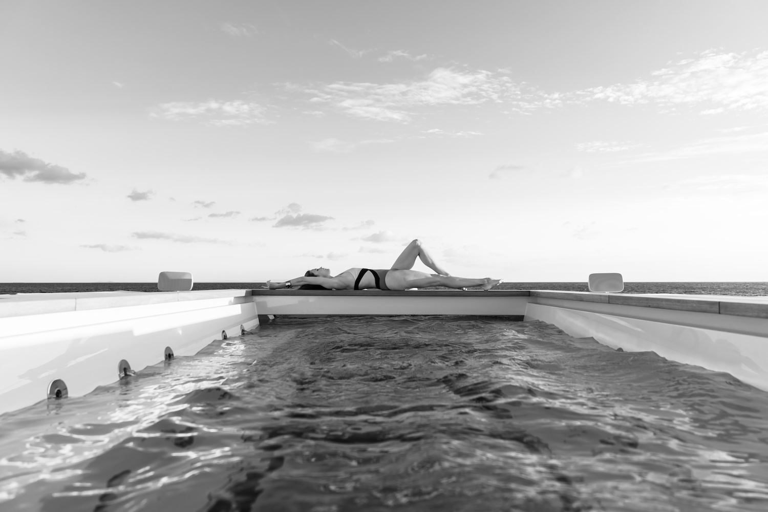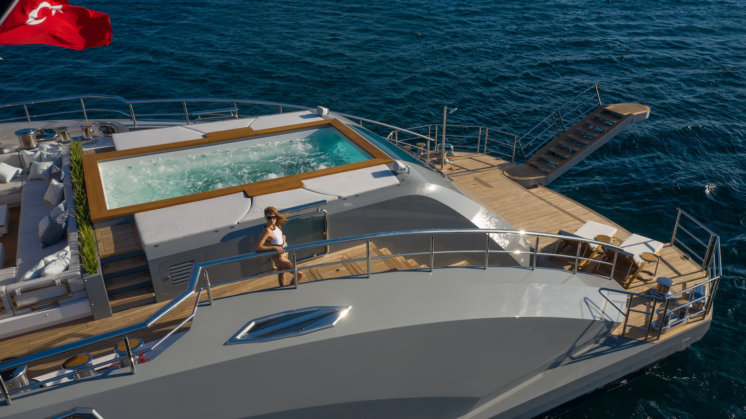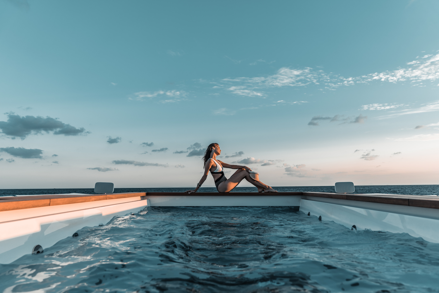 On the main deck aft, stepping out from the main saloon, guests will find a large pool surrounded by sun pads.