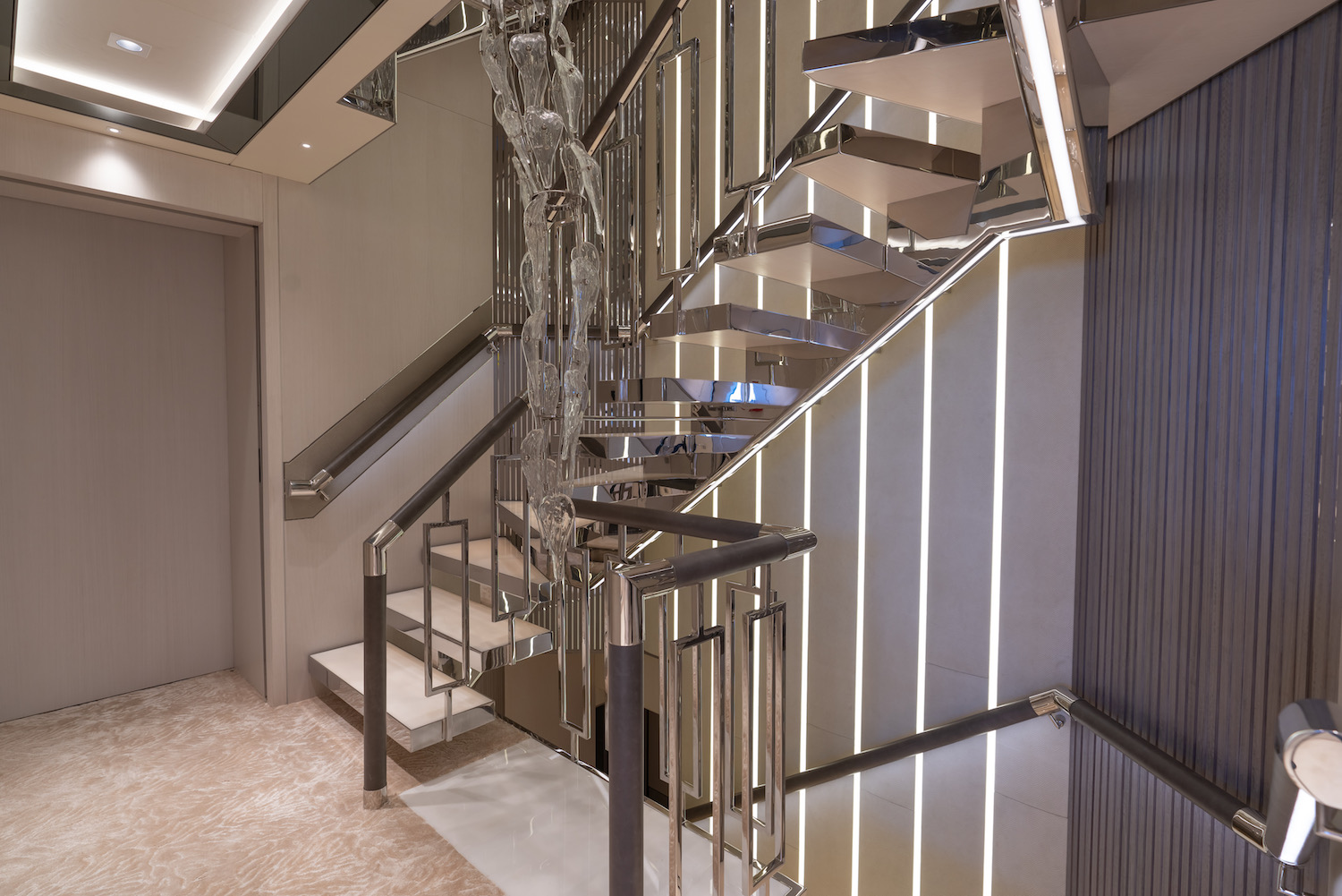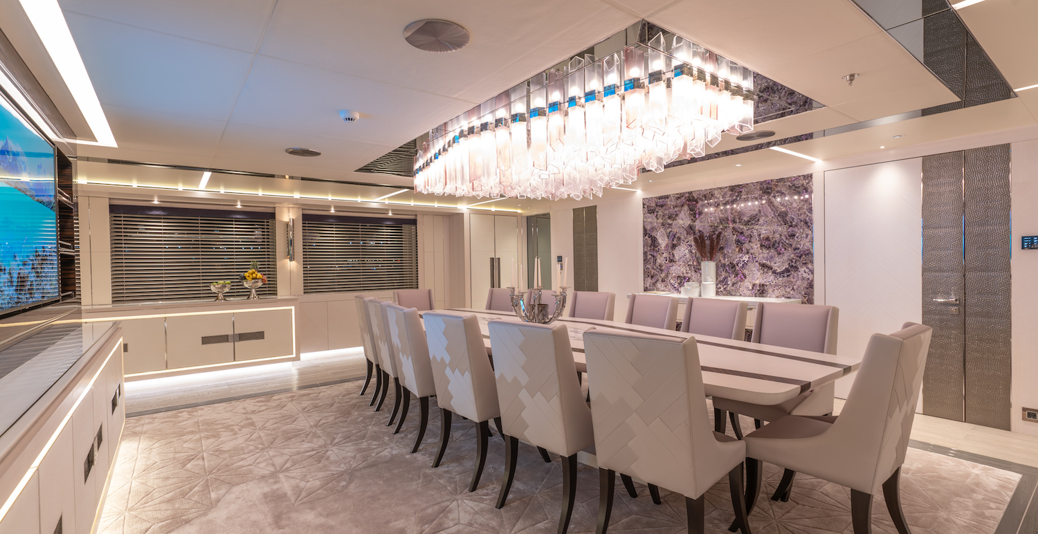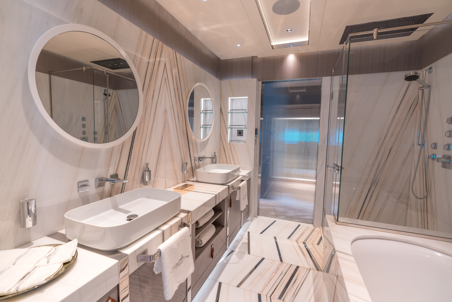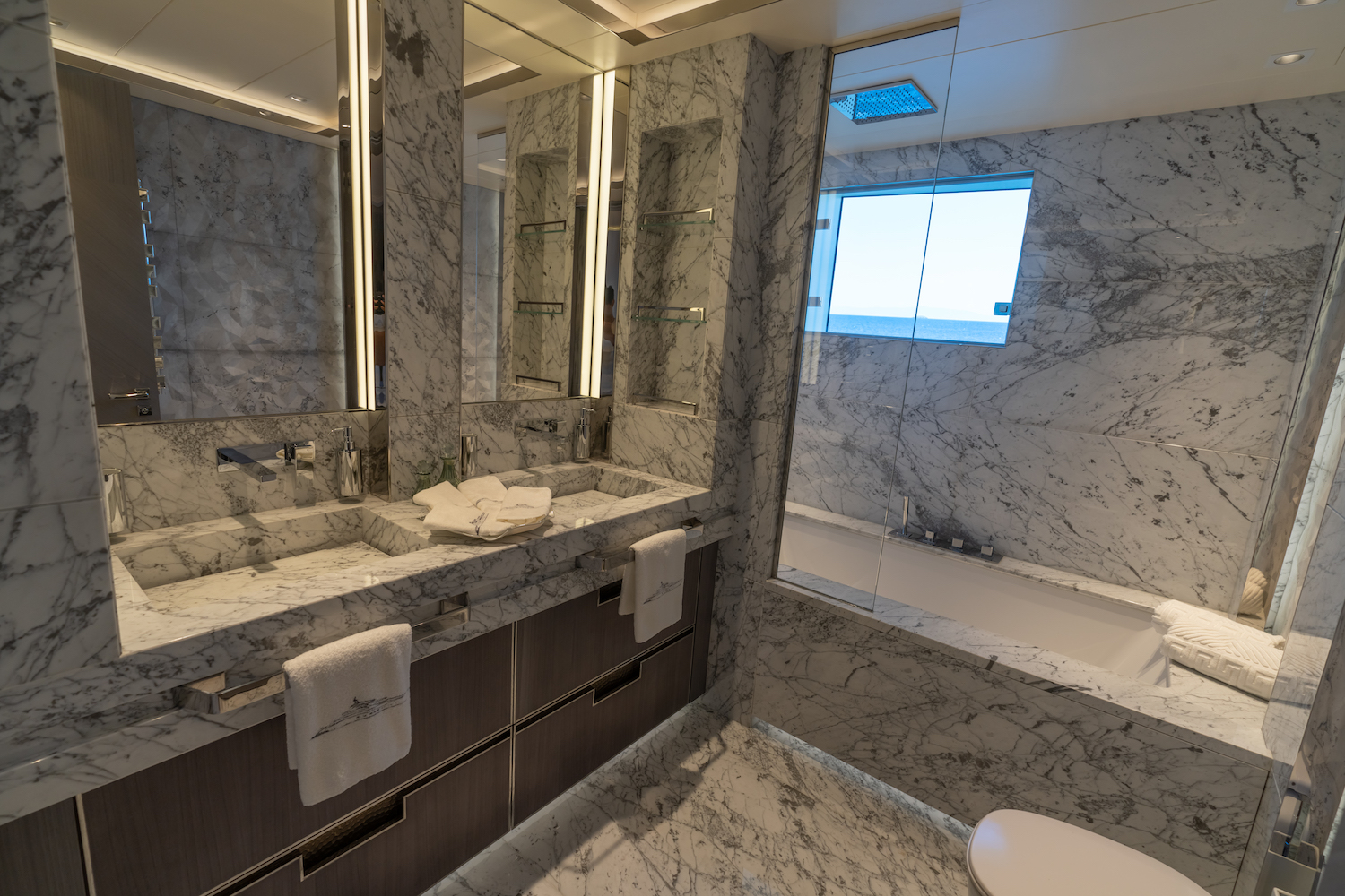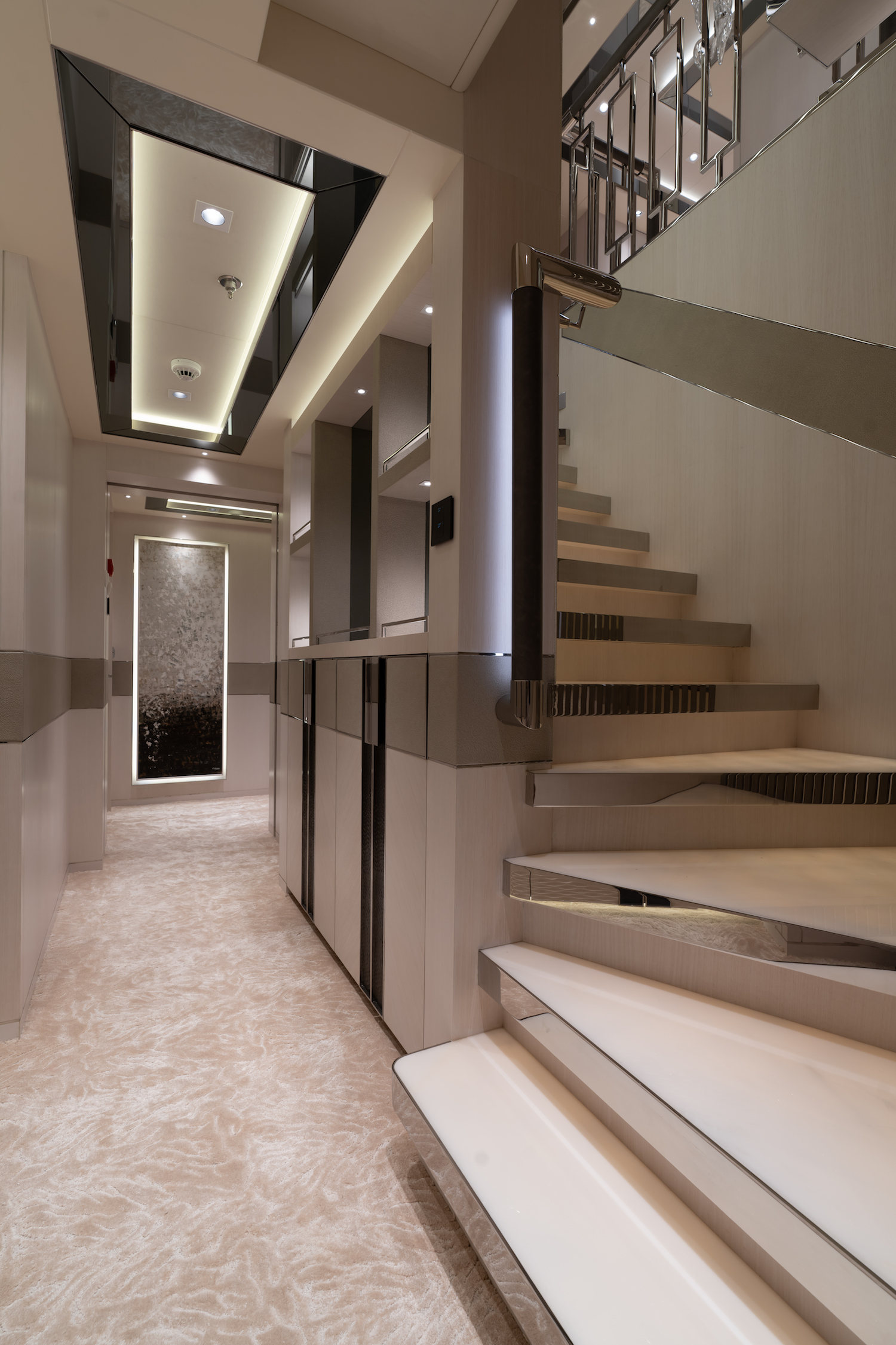 Her interior feature beautiful Macassar ebony, Eucalyptus and an extensive use of marble throughout, creating a real luxury environment on board. Accommodation on board spreads over 8 deluxe cabins, sleeping up to 12 guests, while there is also accommodation for a crew of 20.