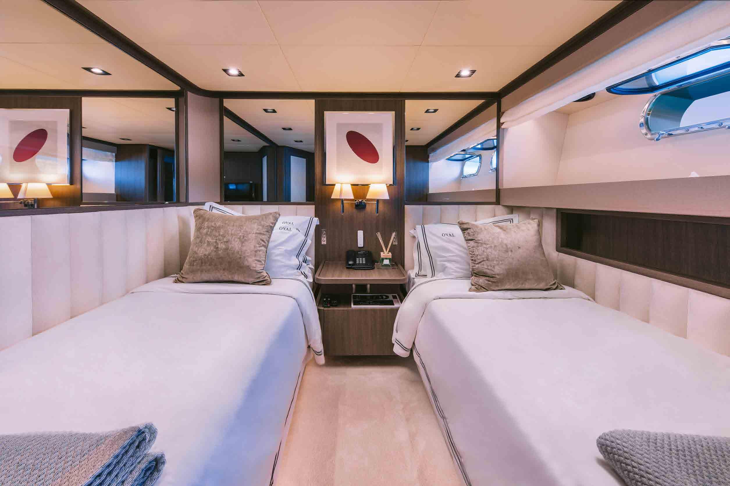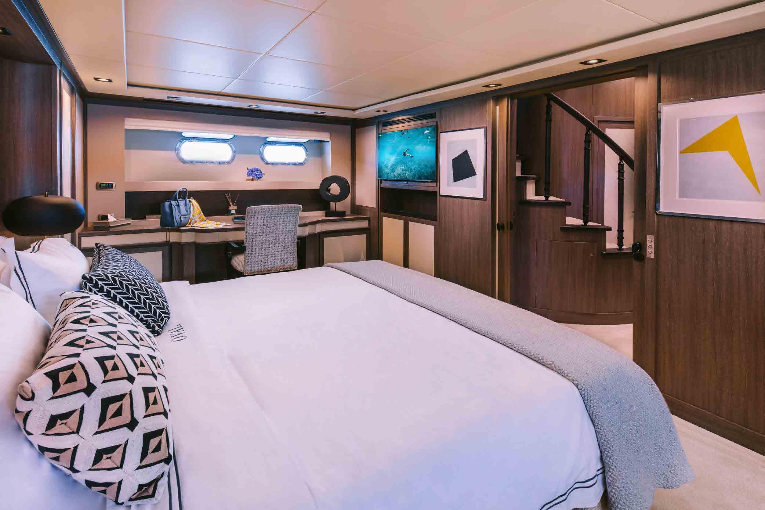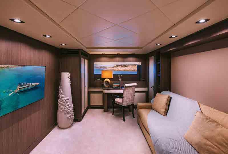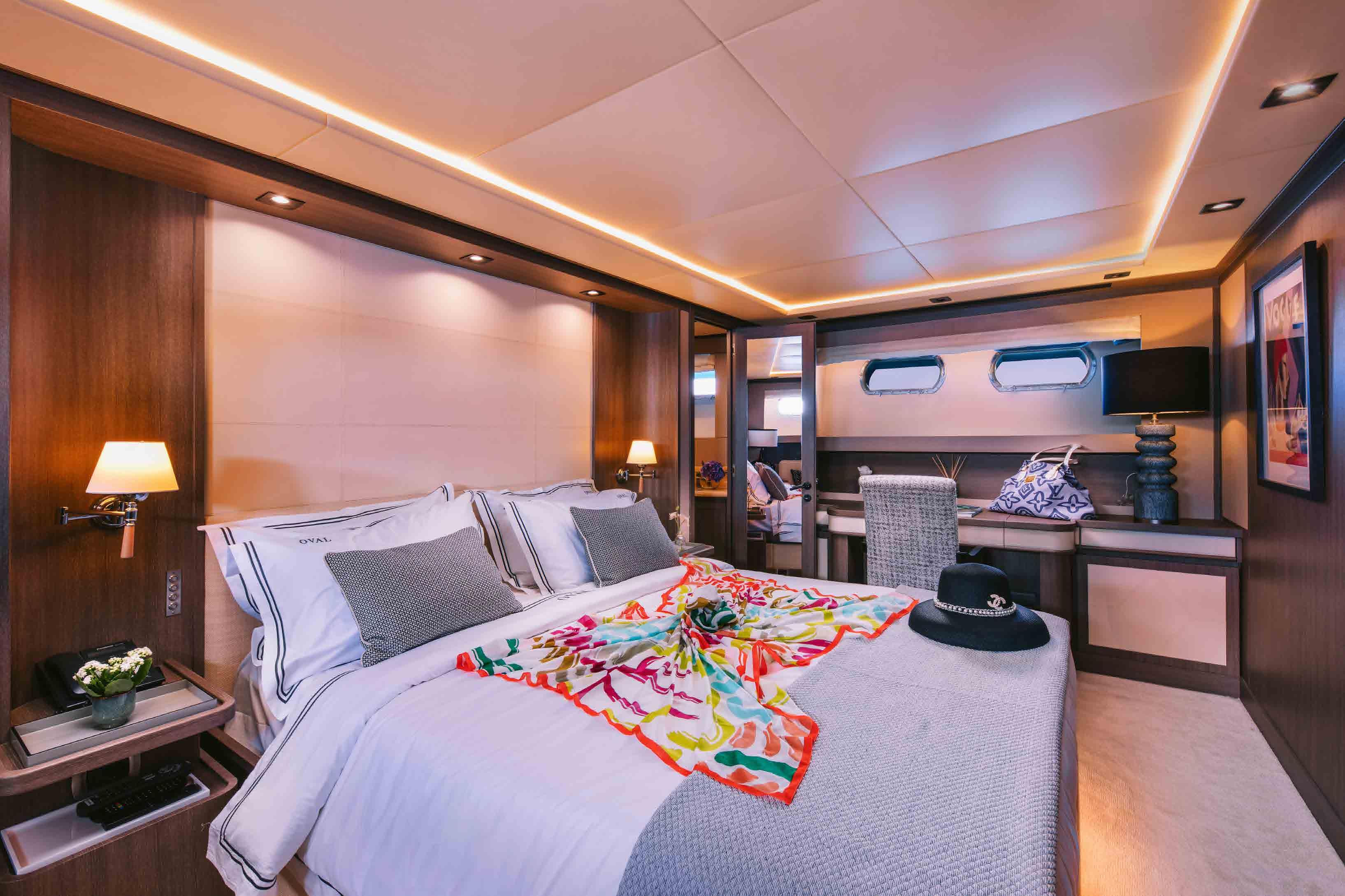 The accommodation sleeps a total of 11 guests over 5 en-suite cabins: 1 Master suite, 1 VIP stateroom, 1 convertible double cabin and 2 twin cabins. The Master suite is placed amidships on the lower deck to have the benefit of the full beam. The room contains a king-sized bed, widescreen TV, desk/vanity, sofa, large wardrobe and an en-suite bathroom with a sink, toilet, bidet and shower. The VIP stateroom is on the lower deck and is furnished with a king-sized bed, widescreen TV, desk/vanity, and an en-suite bathroom with a sink, toilet and shower. The double cabin on the main deck forward is convertible to a private office/lounge with the queen-sized bed folding to become a sofa. The room is also furnished with a widescreen TV, desk/vanity, plenty of storage and an en-suite bathroom with a sink, toilet and shower. The twin cabins both have two single beds, a widescreen TV, ample storage and an en-suite bathroom with a sink, toilet and shower. The professional crew of 6 will ensure that all guests on board receive first-class service throughout their stay.