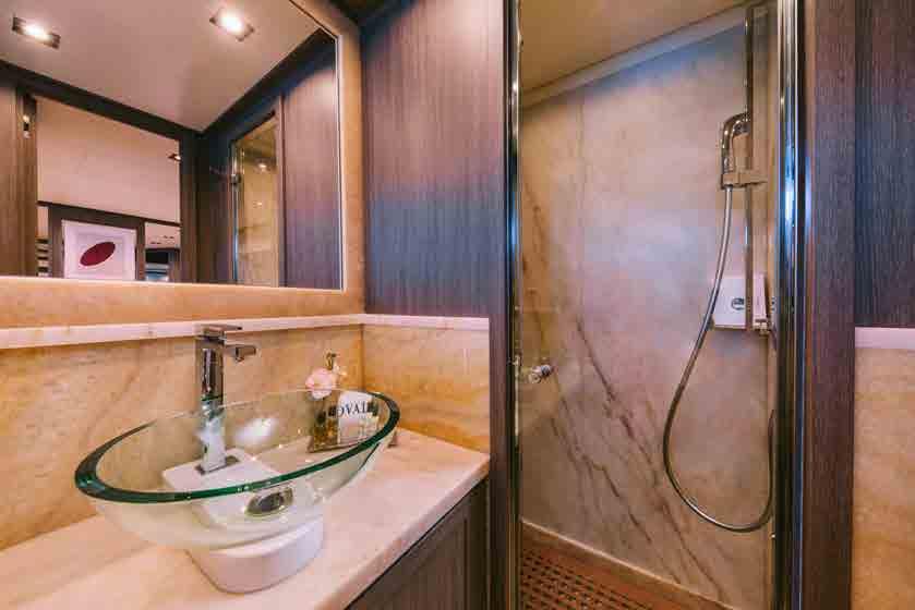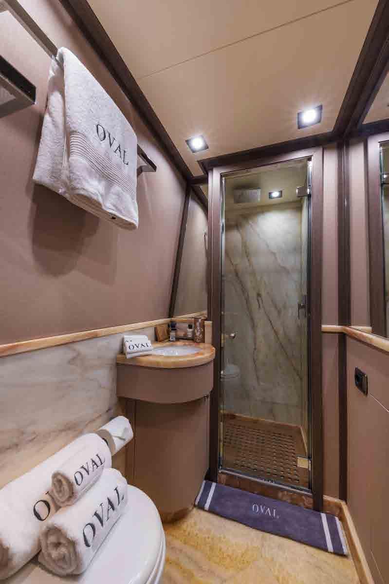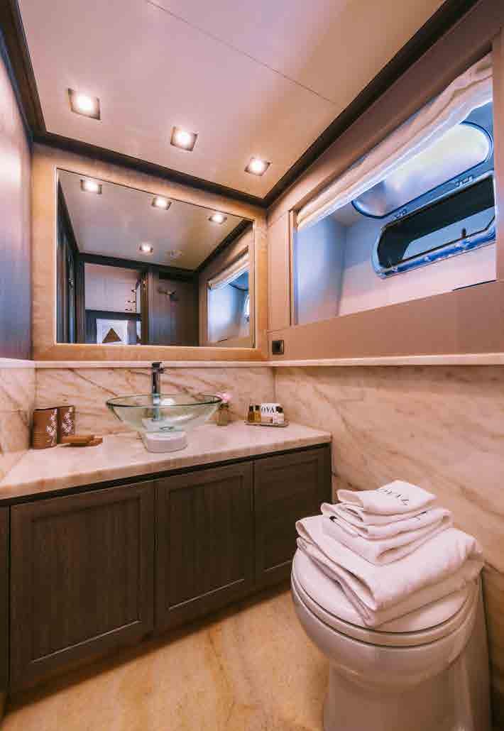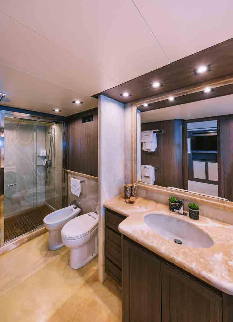 The accommodation sleeps a total of 11 guests over 5 en-suite cabins: 1 Master suite, 1 VIP stateroom, 1 convertible double cabin and 2 twin cabins. The Master suite is placed amidships on the lower deck to have the benefit of the full beam. The room contains a king-sized bed, widescreen TV, desk/vanity, sofa, large wardrobe and an en-suite bathroom with a sink, toilet, bidet and shower. The VIP stateroom is on the lower deck and is furnished with a king-sized bed, widescreen TV, desk/vanity, and an en-suite bathroom with a sink, toilet and shower. The double cabin on the main deck forward is convertible to a private office/lounge with the queen-sized bed folding to become a sofa. The room is also furnished with a widescreen TV, desk/vanity, plenty of storage and an en-suite bathroom with a sink, toilet and shower. The twin cabins both have two single beds, a widescreen TV, ample storage and an en-suite bathroom with a sink, toilet and shower. The professional crew of 6 will ensure that all guests on board receive first-class service throughout their stay.