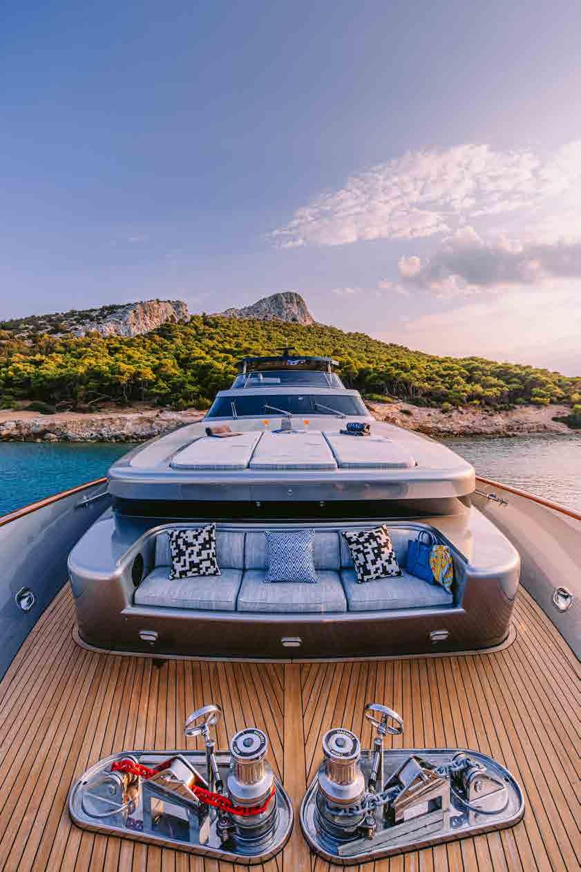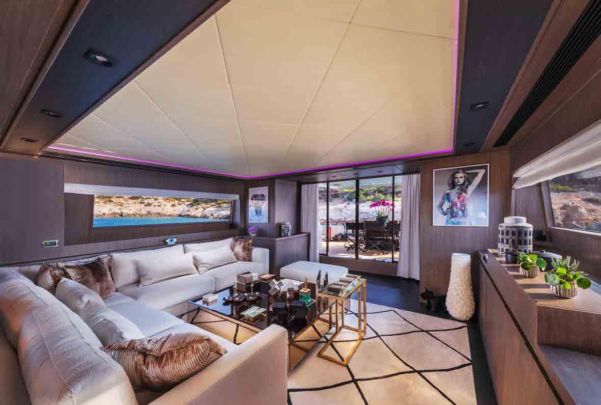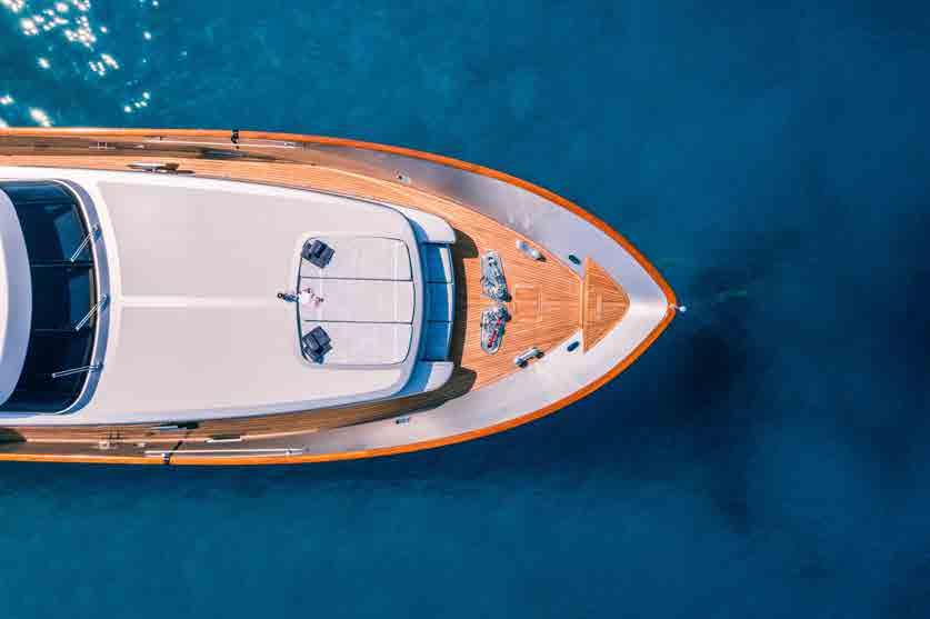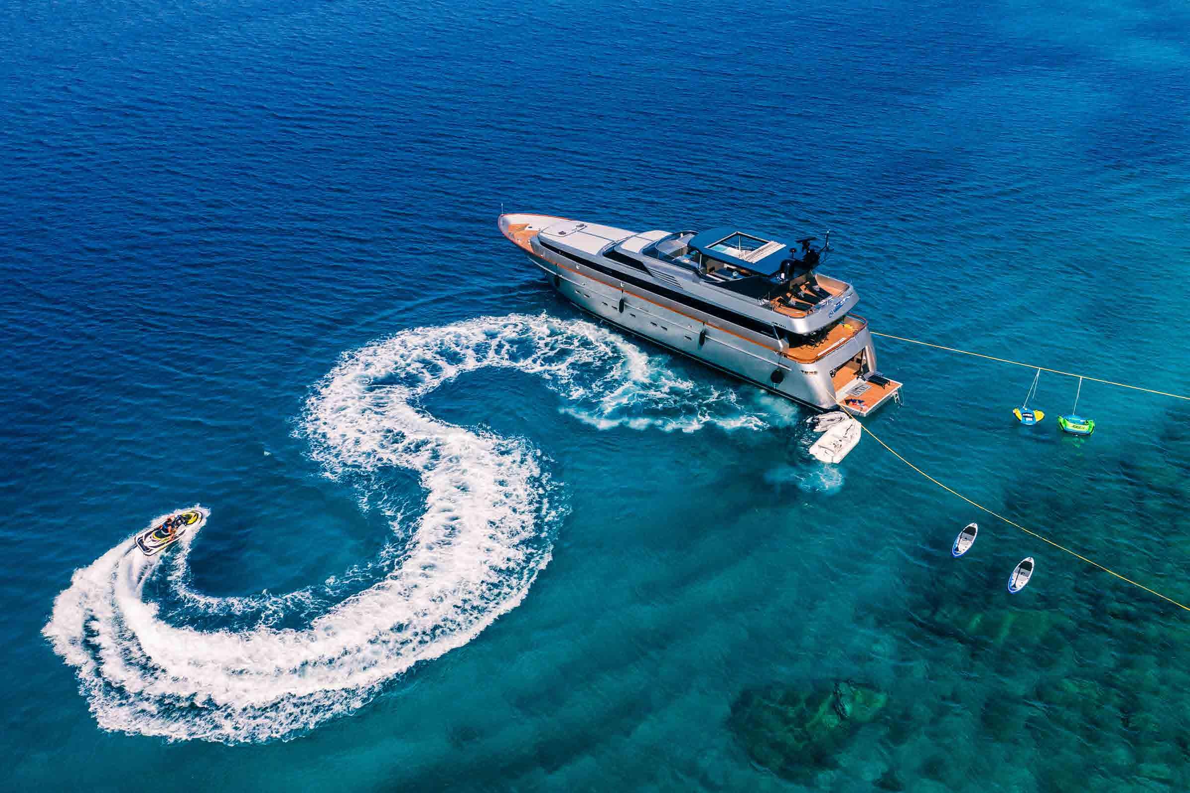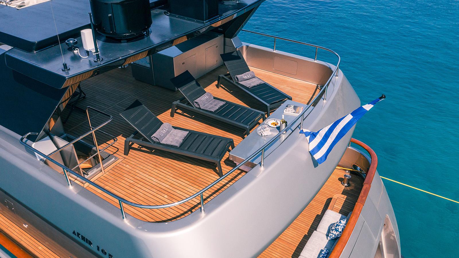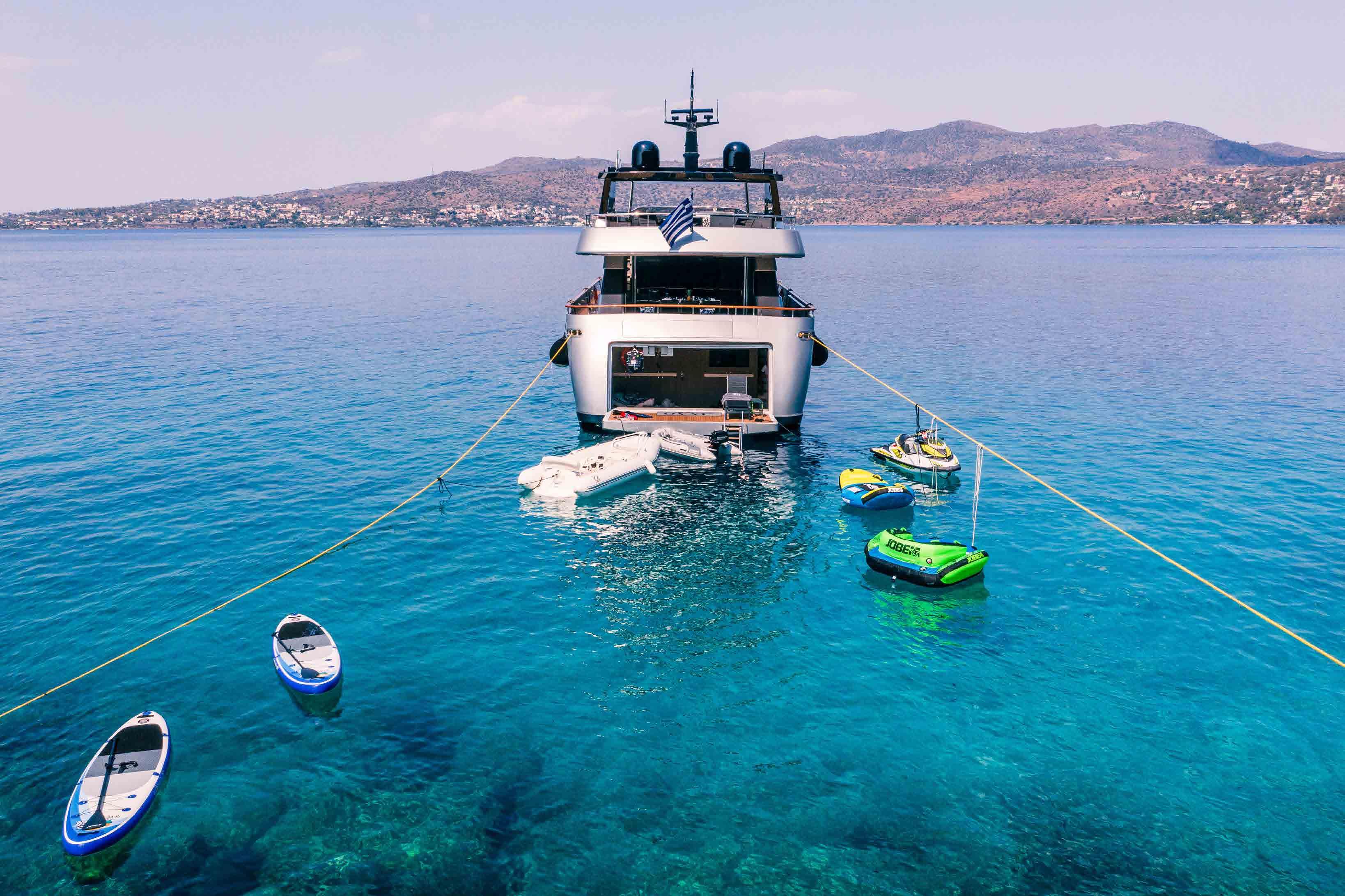 The beach club has a fold down transom door to make a large swim platform for sunbathing and lounging beside the water, as well as granting easy access to the tender and water toys.
