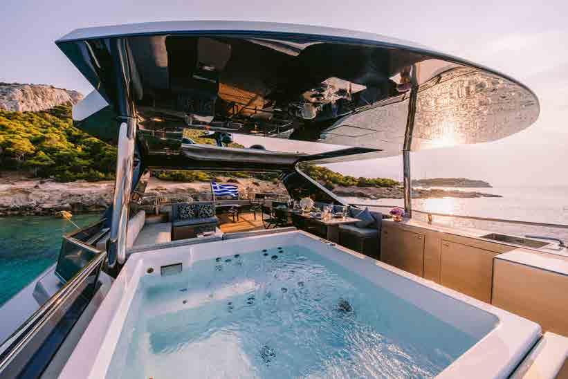 The raised pilothouse provides access through to the flybridge above and amenities including the Jacuzzi and main alfresco dining area.