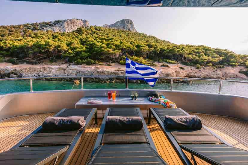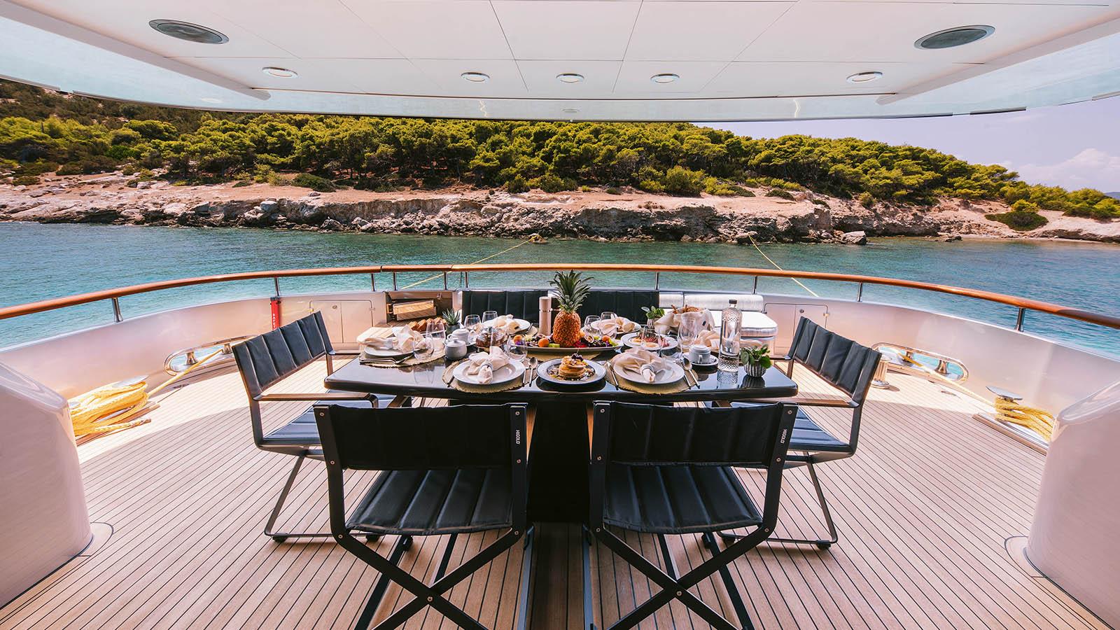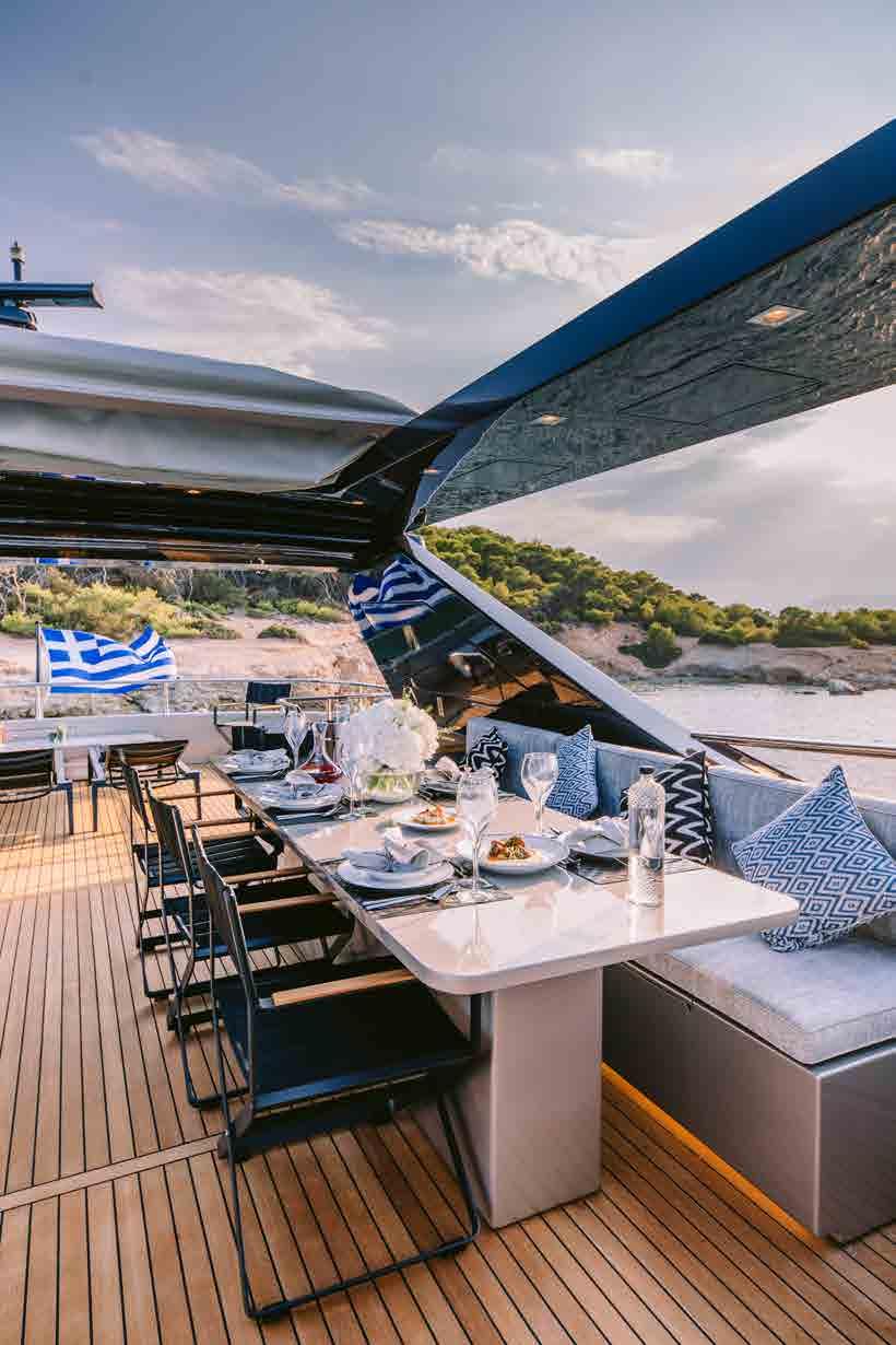The main deck aft is a convivial outdoor lounging and dining area, providing an alfresco dining table for six and a sofa along the stern where guests can dry off in the sunshine after a dip in the sea.