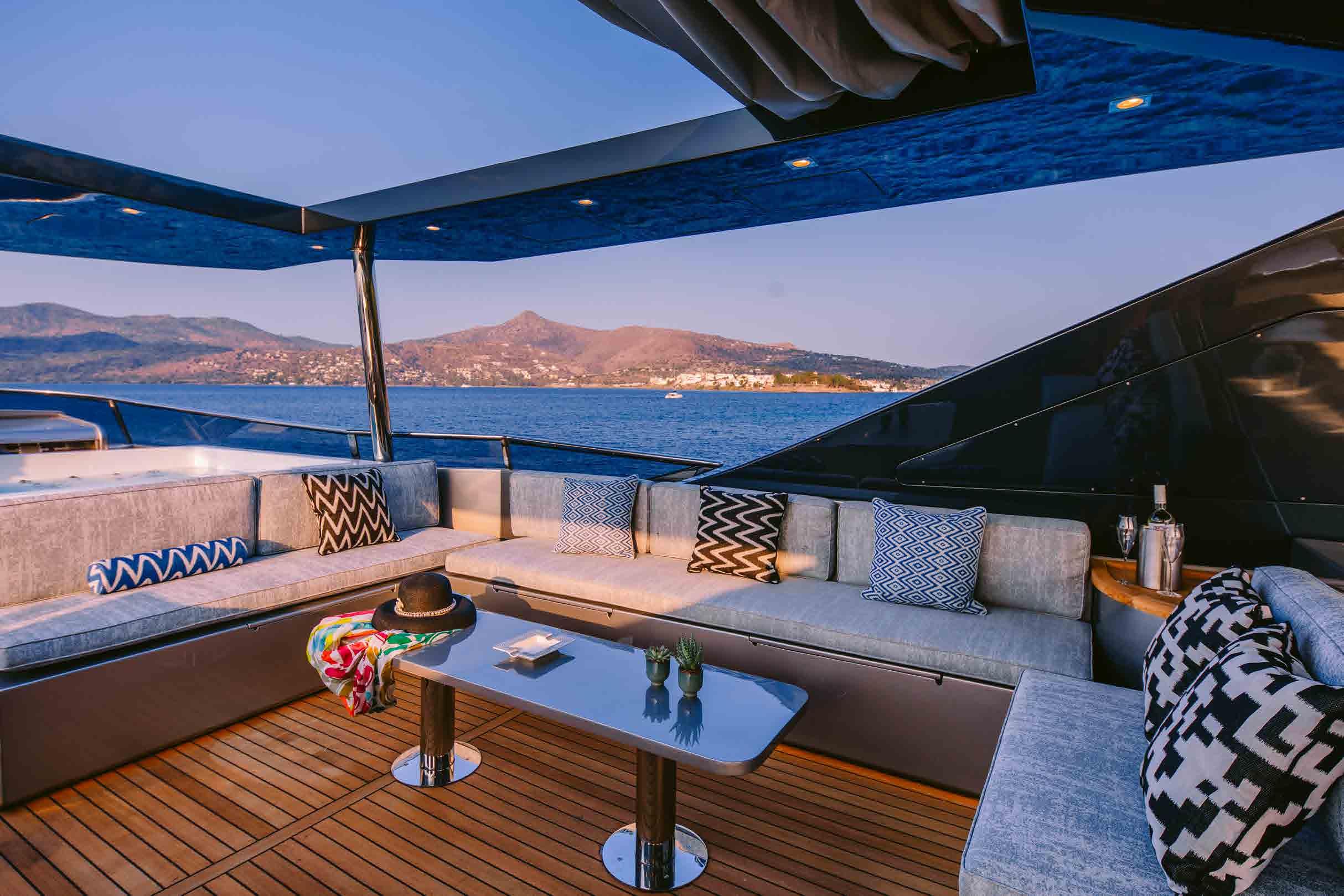 Side walkways around the main deck lead to the forward sunbed and sofa, and the flybridge has sun loungers and a coffee table in the sunshine along the stern, an alfresco dining area to port and a seating area to starboard beneath the retractable sunroof, and a large square Jacuzzi forward to starboard.
