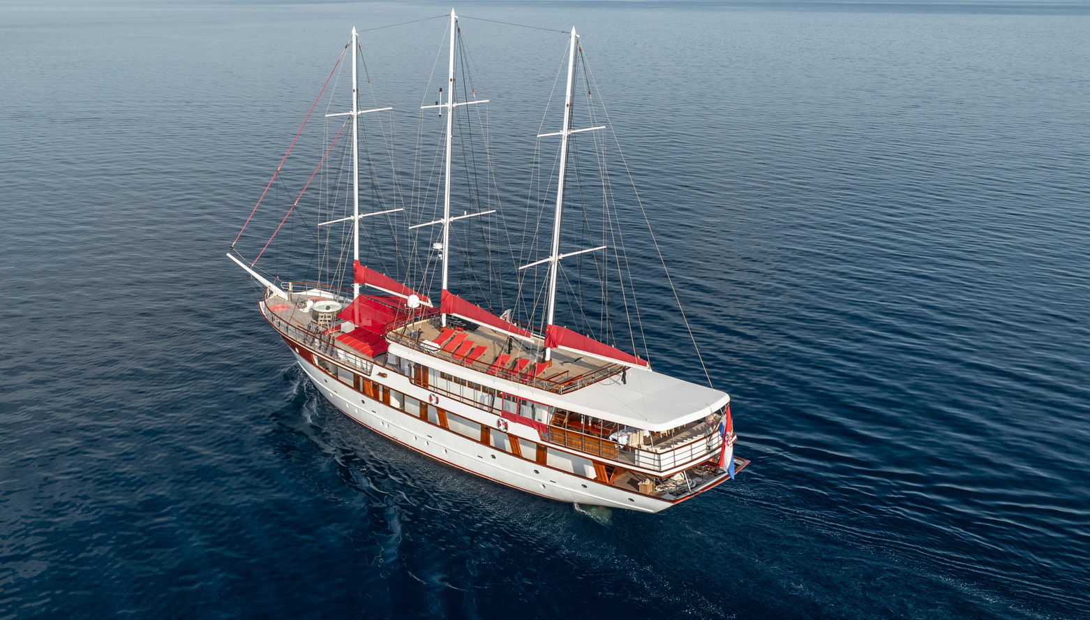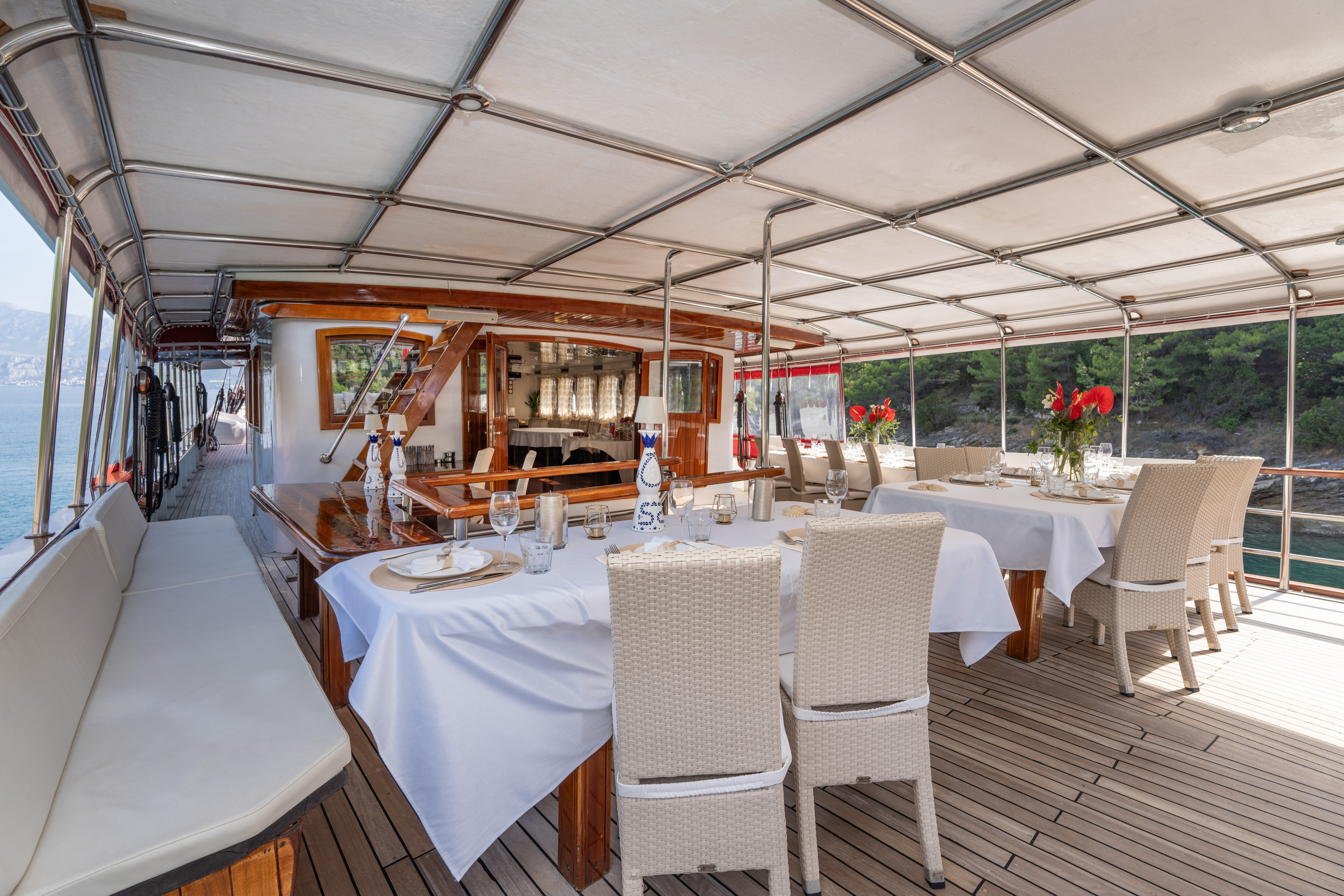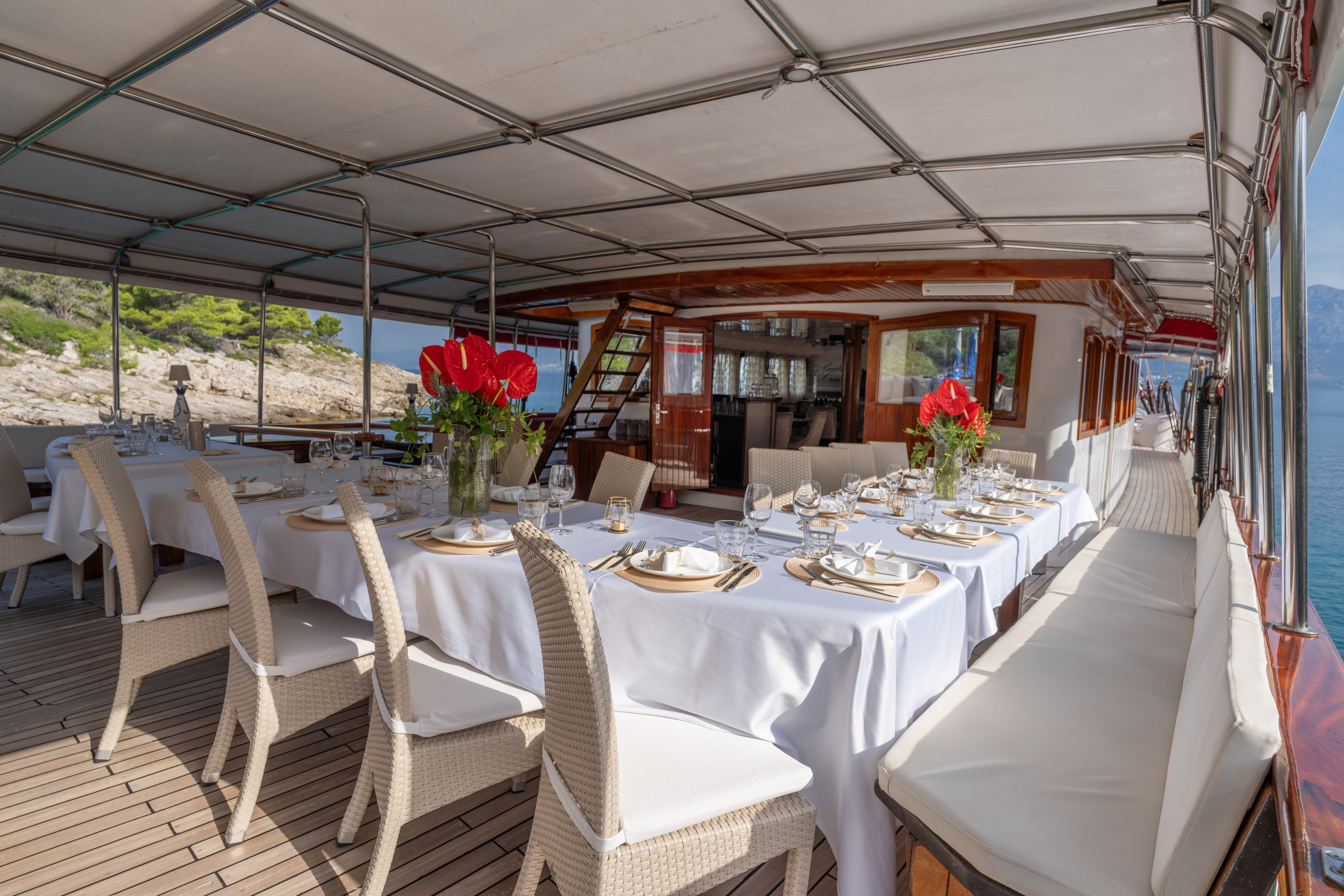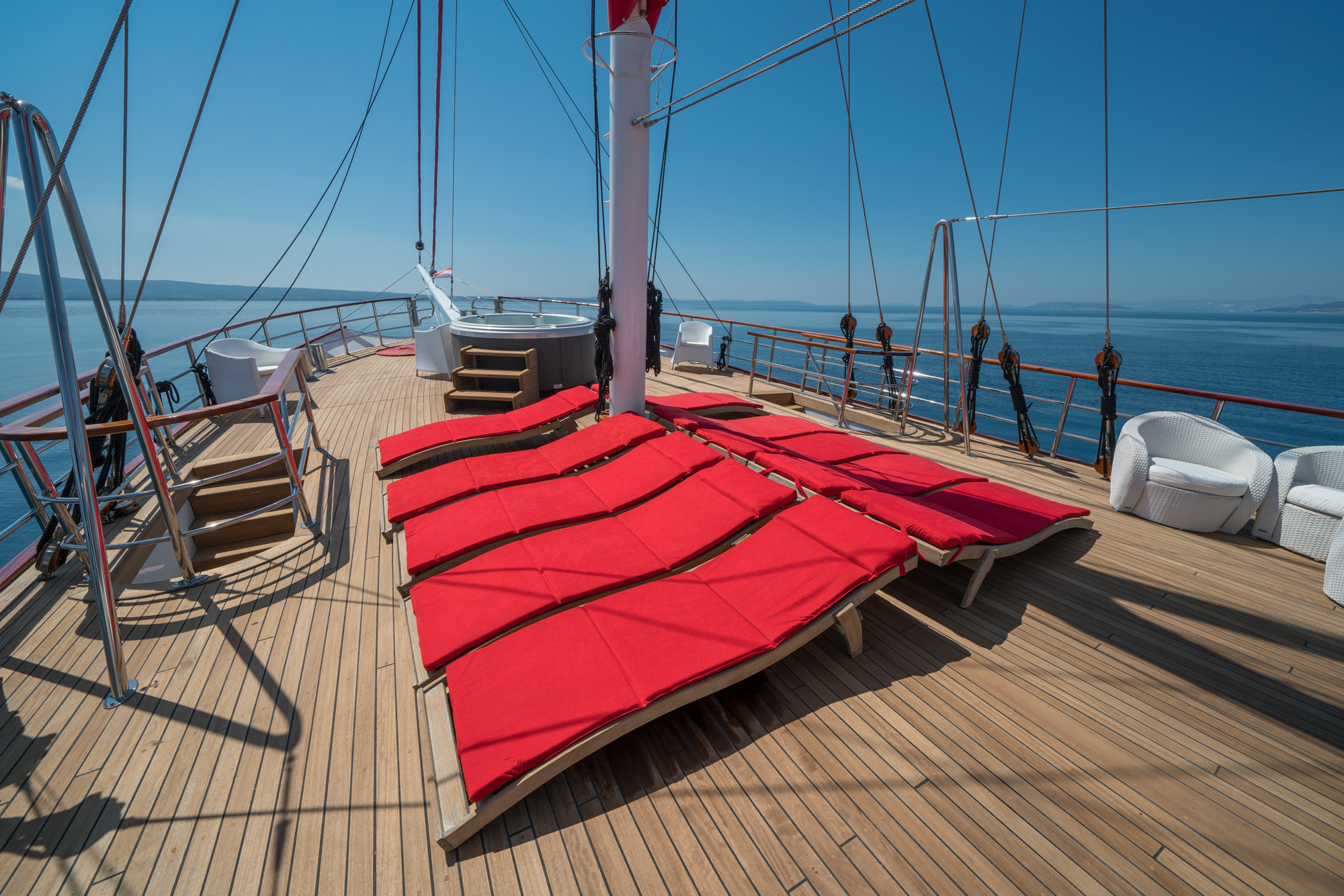 This unique motor sailer offers three exterior deck levels offering inviting entertainment and relaxation areas for guests. The roof top sun deck allows guests to make the most of the surroundings while soaking up the sun in comfort from luxury sun beds. The foredeck has more sun beds which can be covered with a sail shade if required and a six-person jacuzzi. Aft on the upper deck is an elegant dining area sheltered under a soft bimini with a flexible set of tables and chairs which can be arranged as guests require. There is a large sun pad/day bed further aft, where guests can relax with a pre-dinner drink.