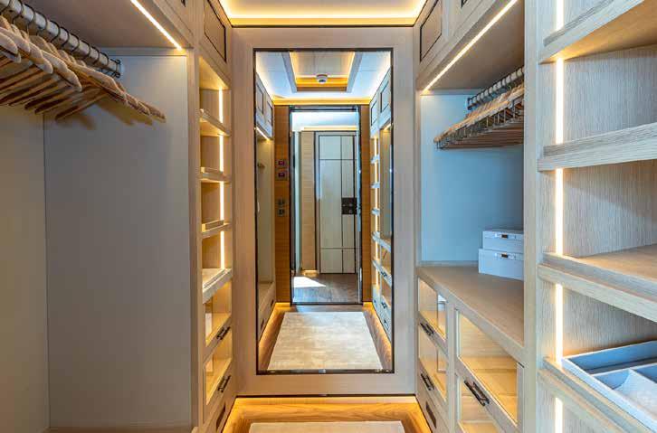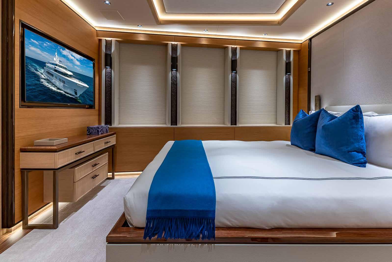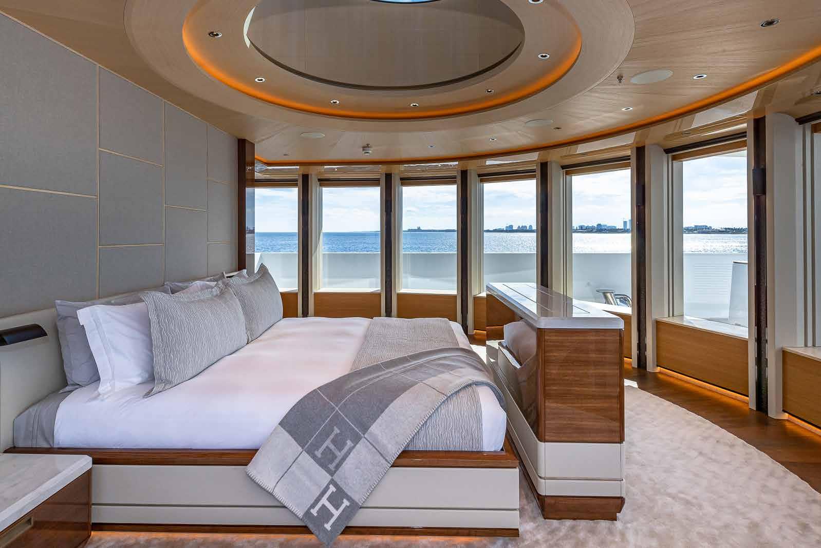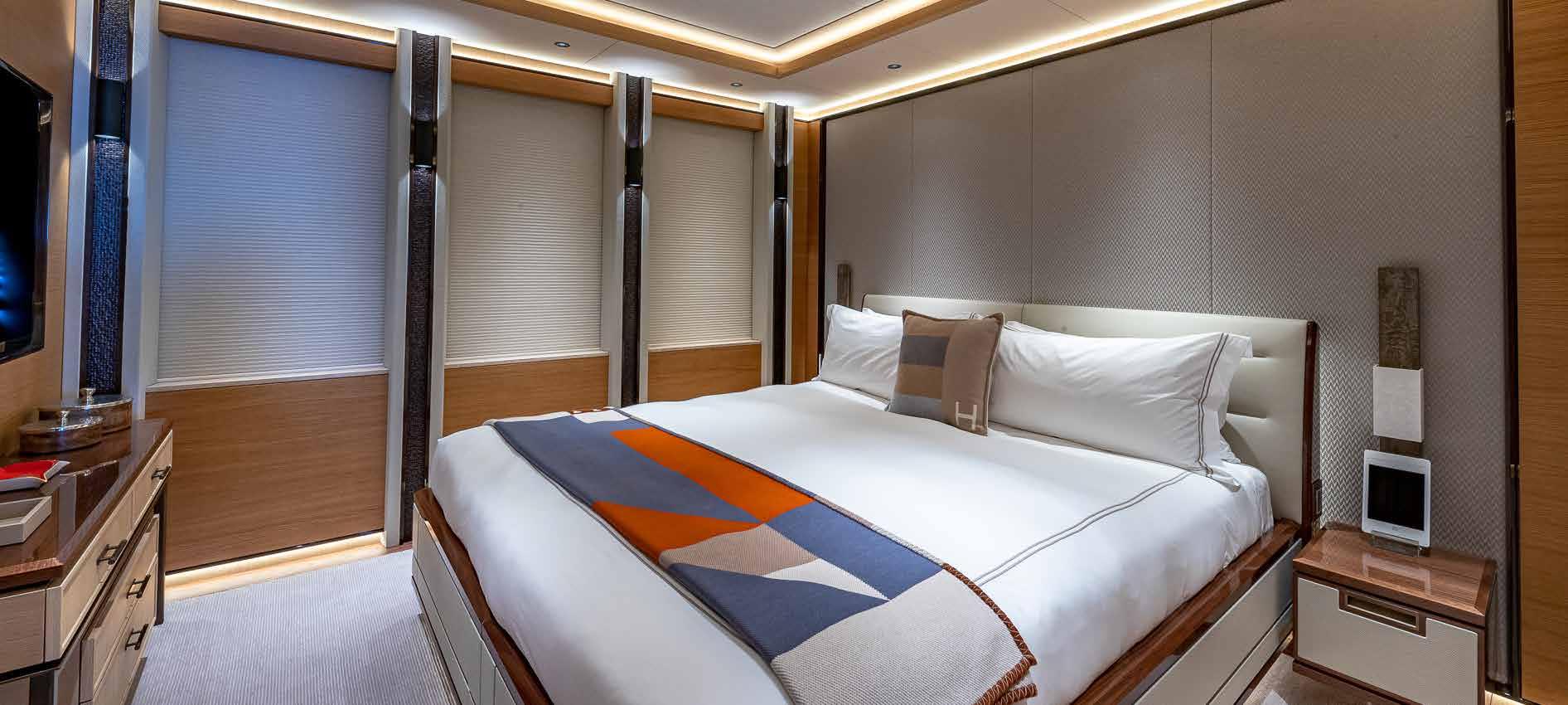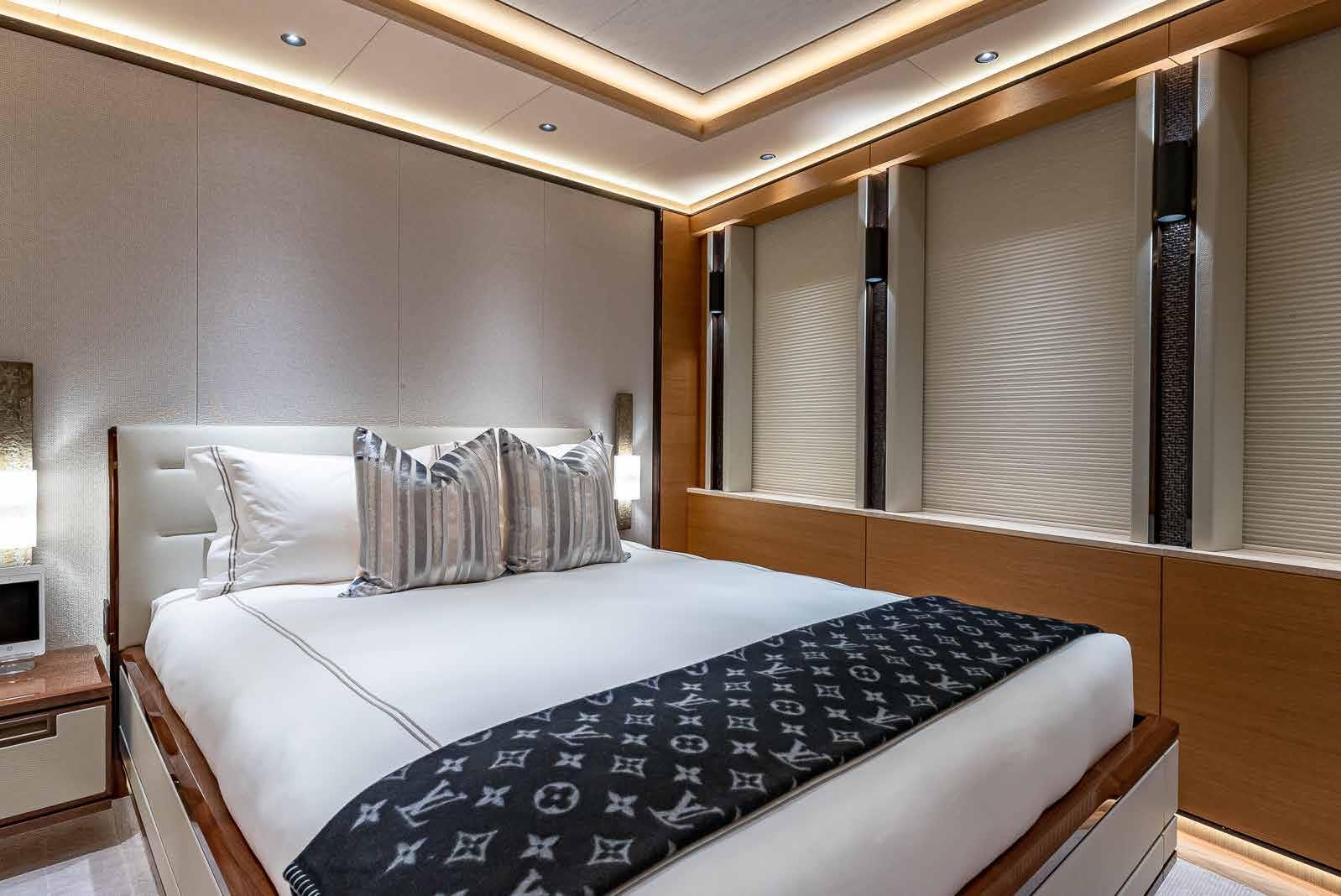 Two stairways lead down to the lower deck swim platform, where guests have access to the beach club as well as plenty of outdoor room for sunbathing and lounging beside the water. The main deck aft also connects to the upper deck aft, where the available space allows for an alfresco dining setting for all 12 guests, plus seating along the stern to enjoy the outdoors after a meal. The foredeck has a large curving sofa with drinks tables to take in the beautiful surroundings in complete comfort, and sunbeds cover the forward section for guests to warm themselves in the summery sunshine.