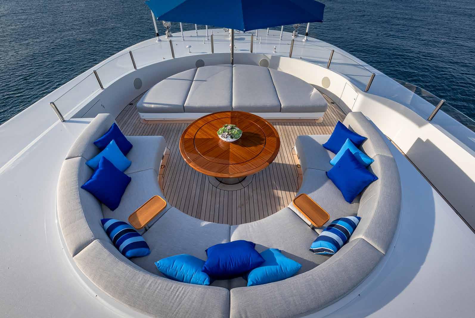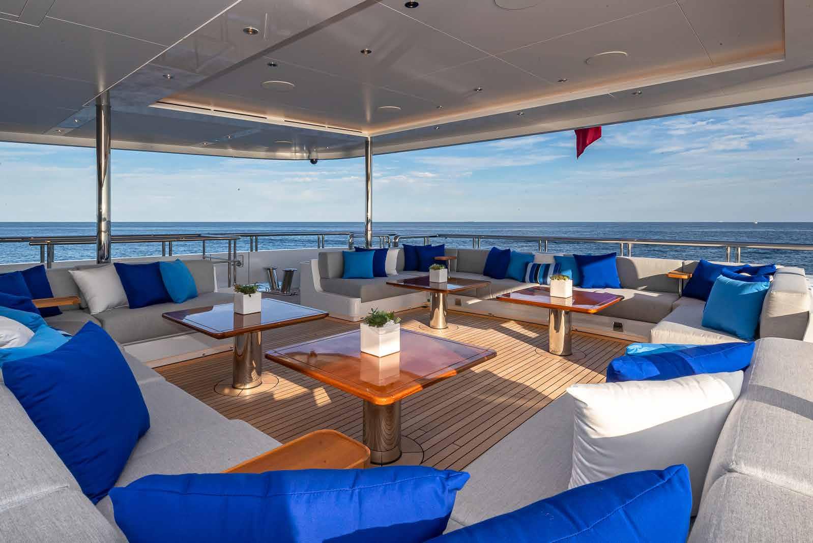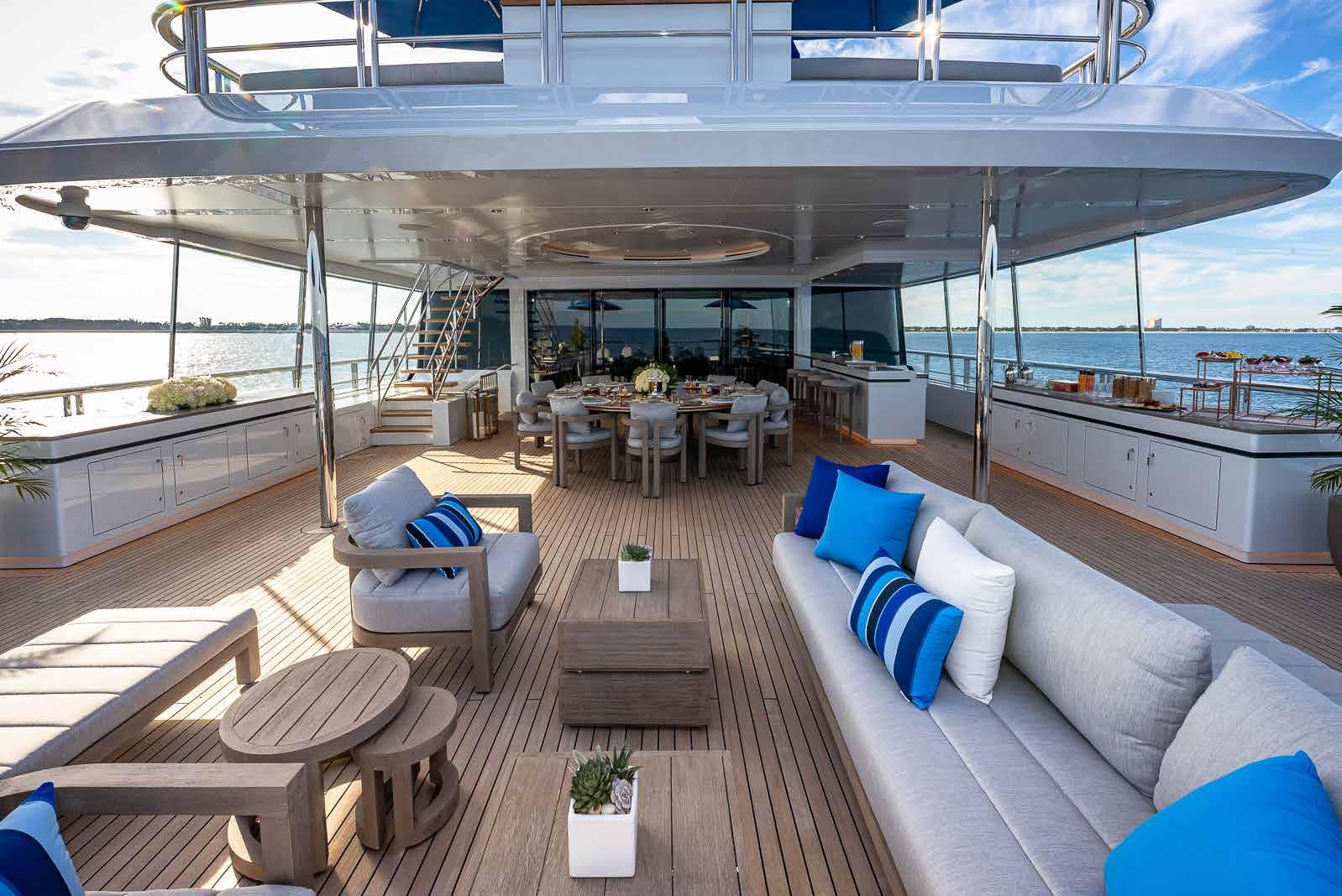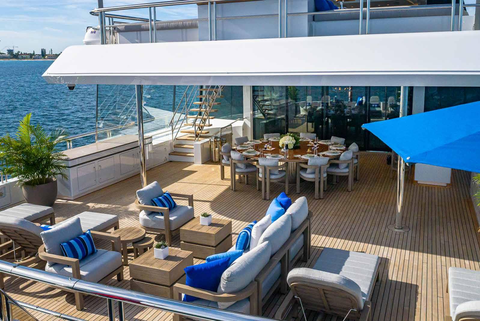 The outdoor areas provide guests with a perfect balance with indoor social areas. The main deck aft is shaded by the upper deck overhang and is lined with a sofa along the stern, with plenty of space for an alfresco dining setting close to the doors into the main salon.