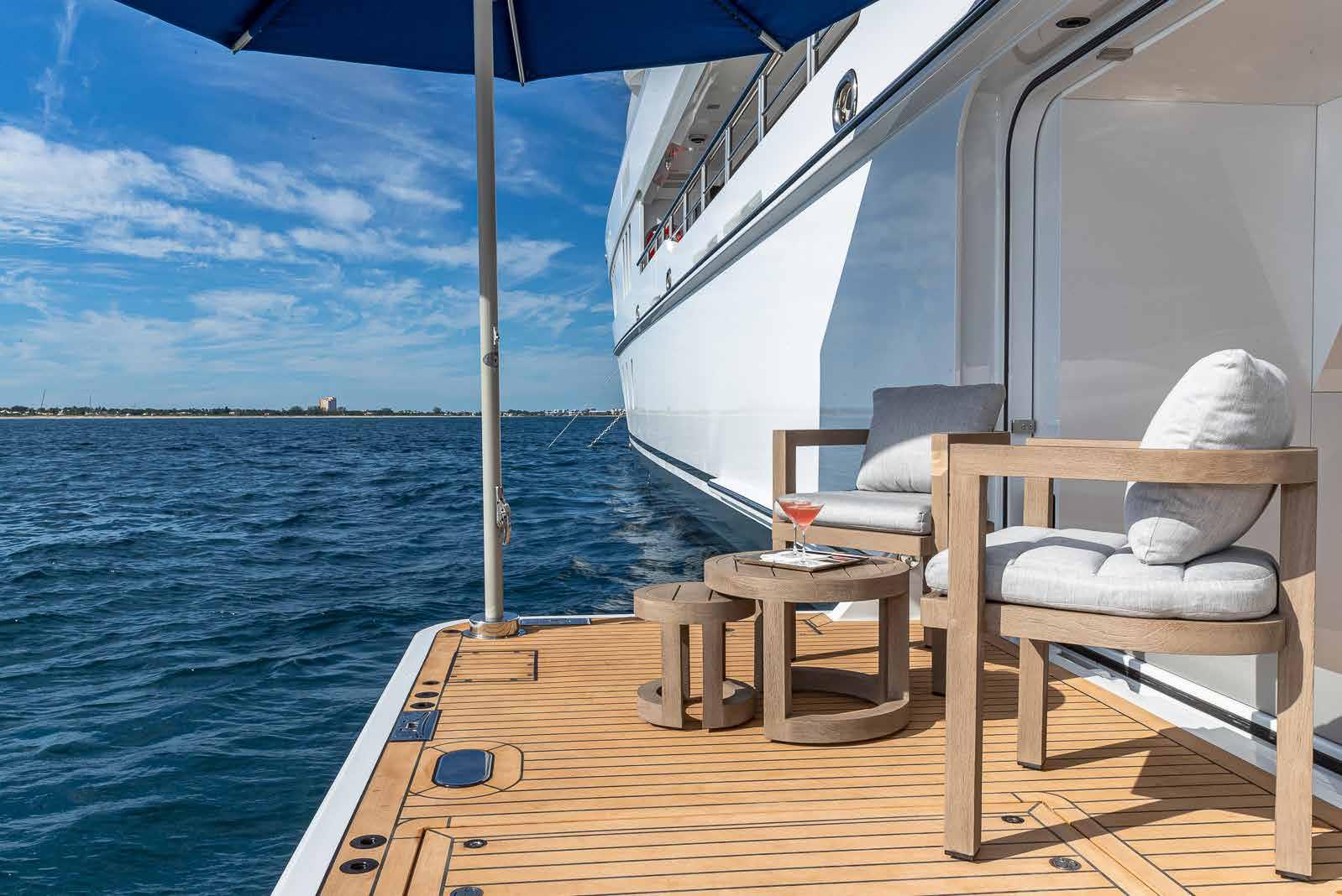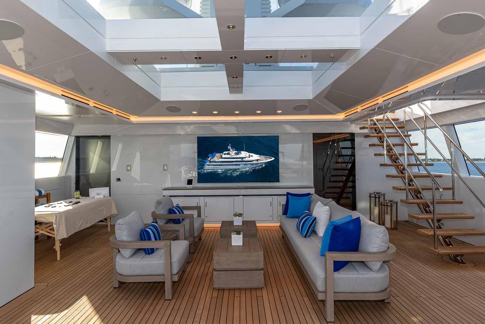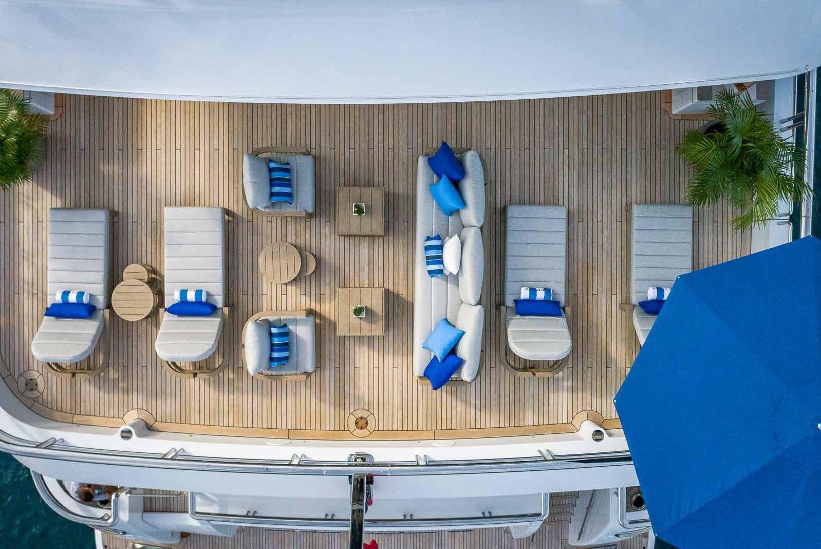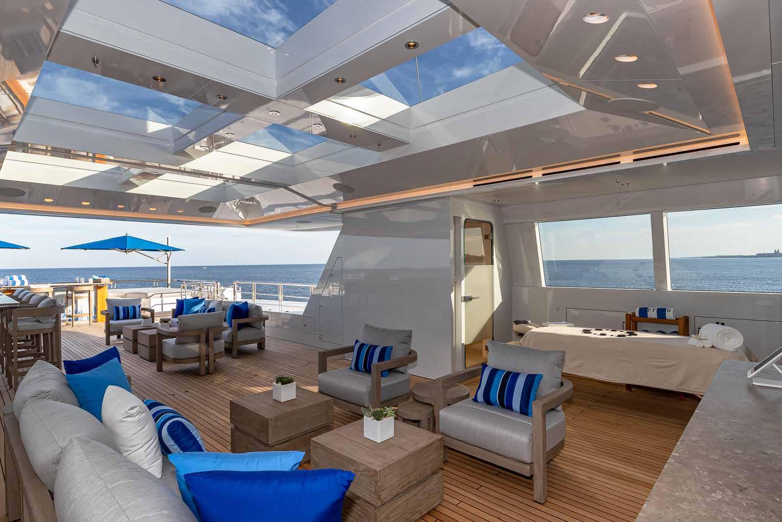 The outdoor areas provide guests with a perfect balance with indoor social areas. The main deck aft is shaded by the upper deck overhang and is lined with a sofa along the stern, with plenty of space for an alfresco dining setting close to the doors into the main salon.