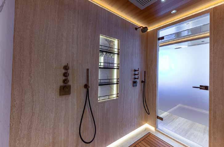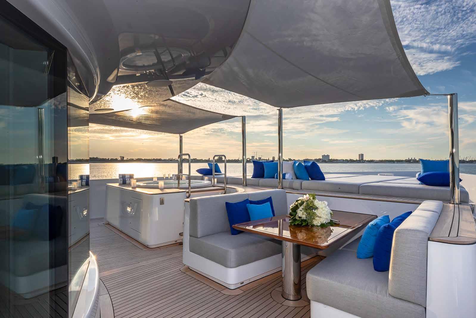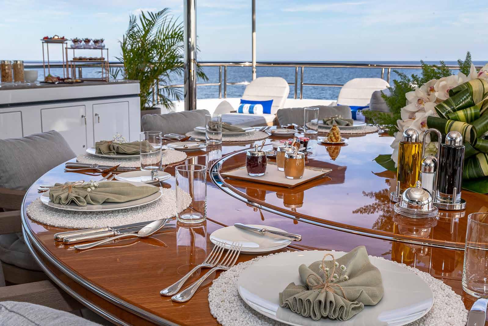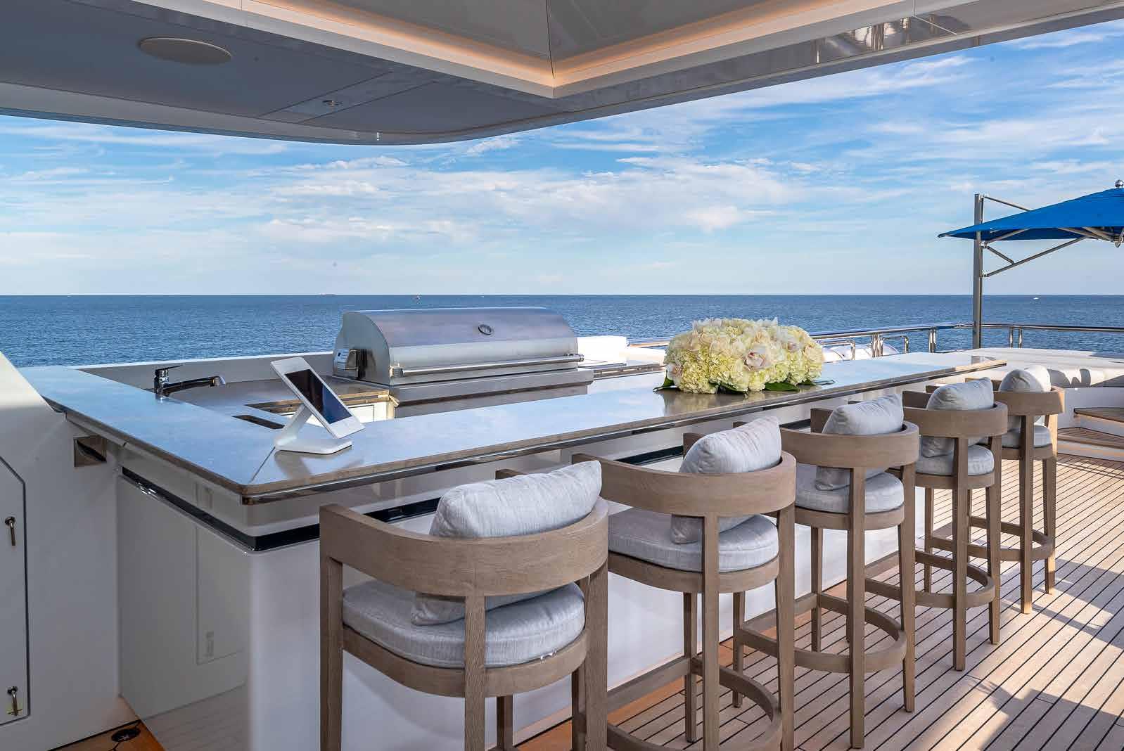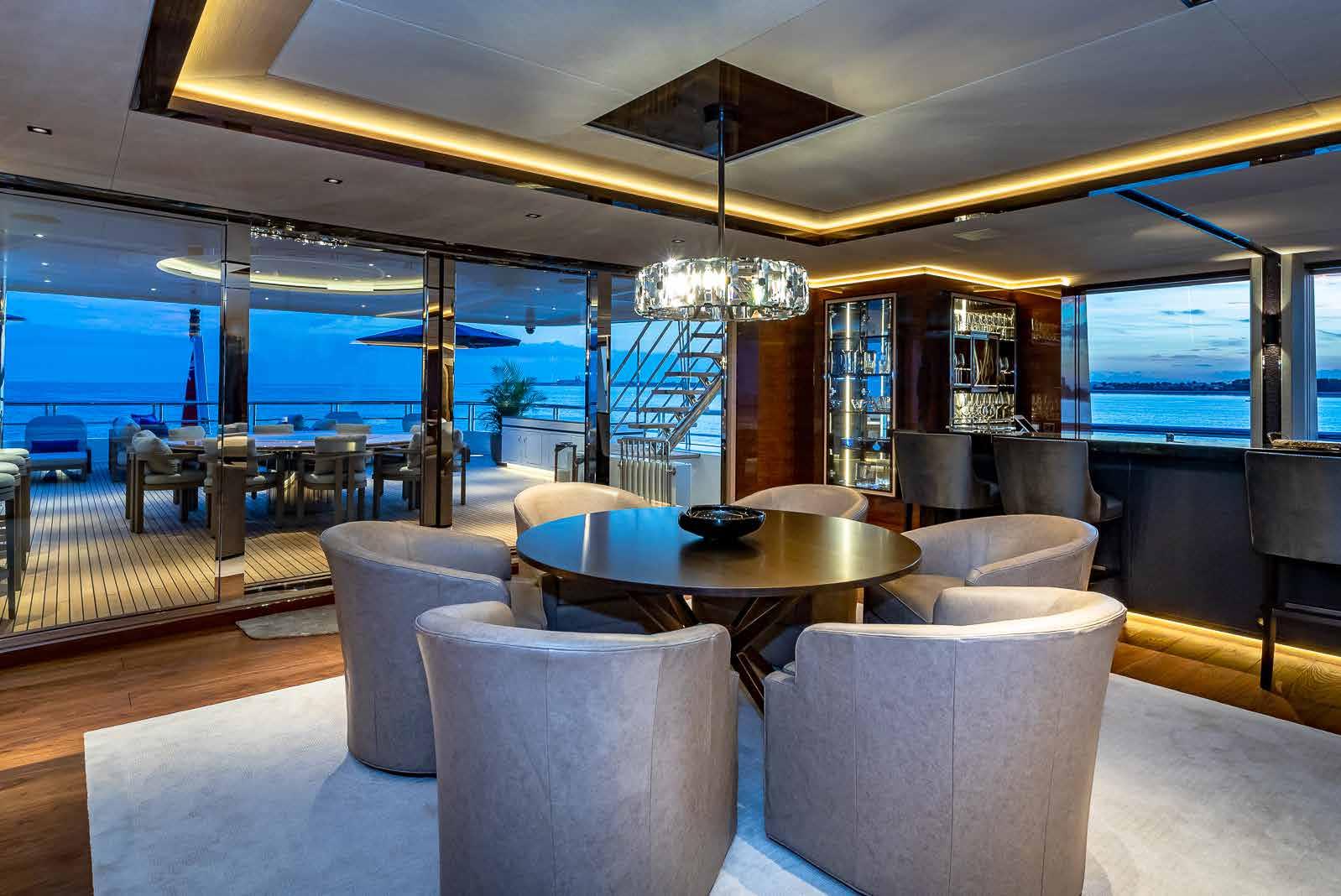 The outdoor areas provide guests with a perfect balance with indoor social areas. The main deck aft is shaded by the upper deck overhang and is lined with a sofa along the stern, with plenty of space for an alfresco dining setting close to the doors into the main salon.