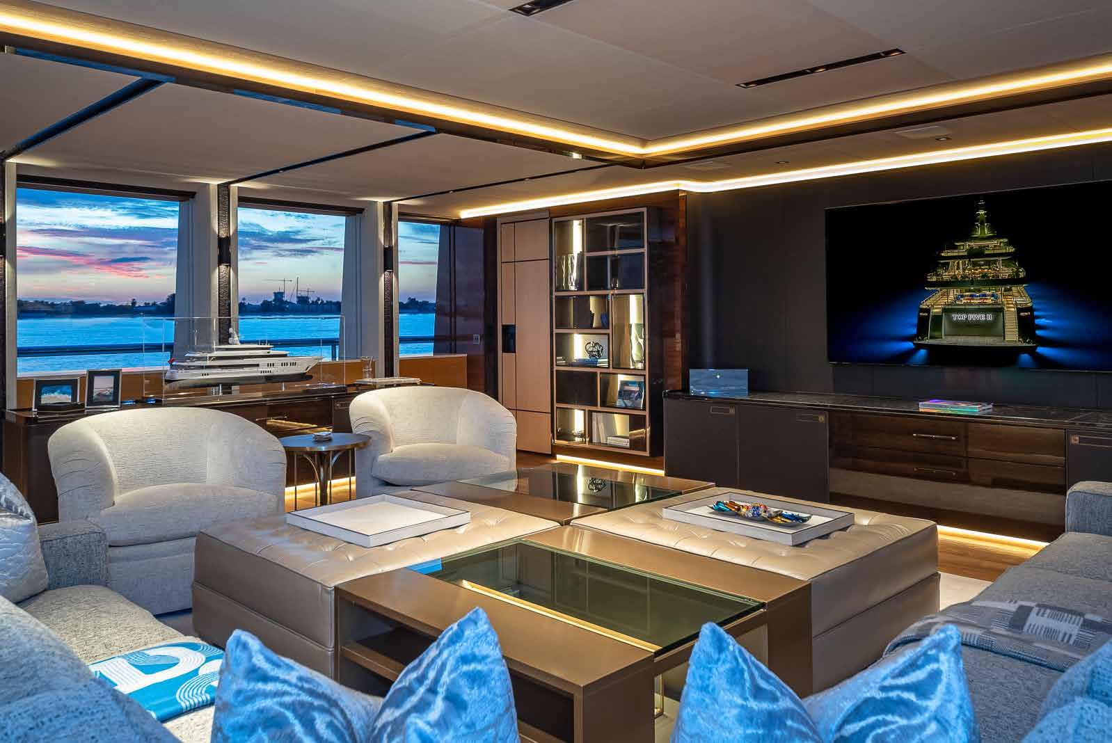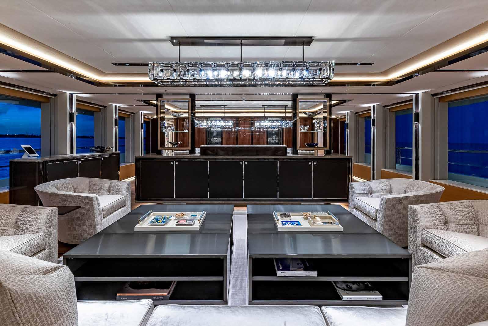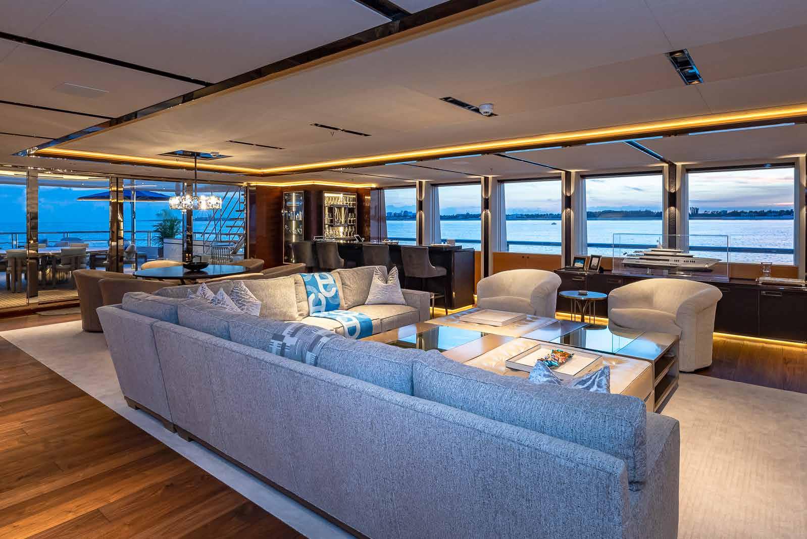 The interiors were styled by Sinot Yacht Architecture & Design, who also styled the exteriors. Few details have been released regarding appearance and layout, however, known amenities include a beach club and sauna along with a main salon and sky lounge.